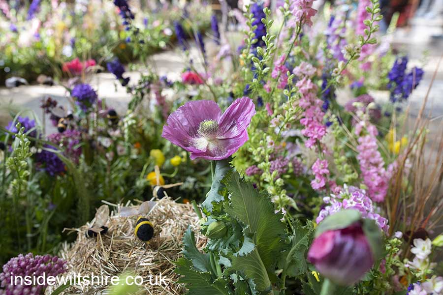 Centrepieces are a replica of the Queen’s Coronation Robe created with dyed grasses and gilded dried plant material, and the Royal Nursery re-imaged in pastel colours, using a mixture of dried and fresh flowers.